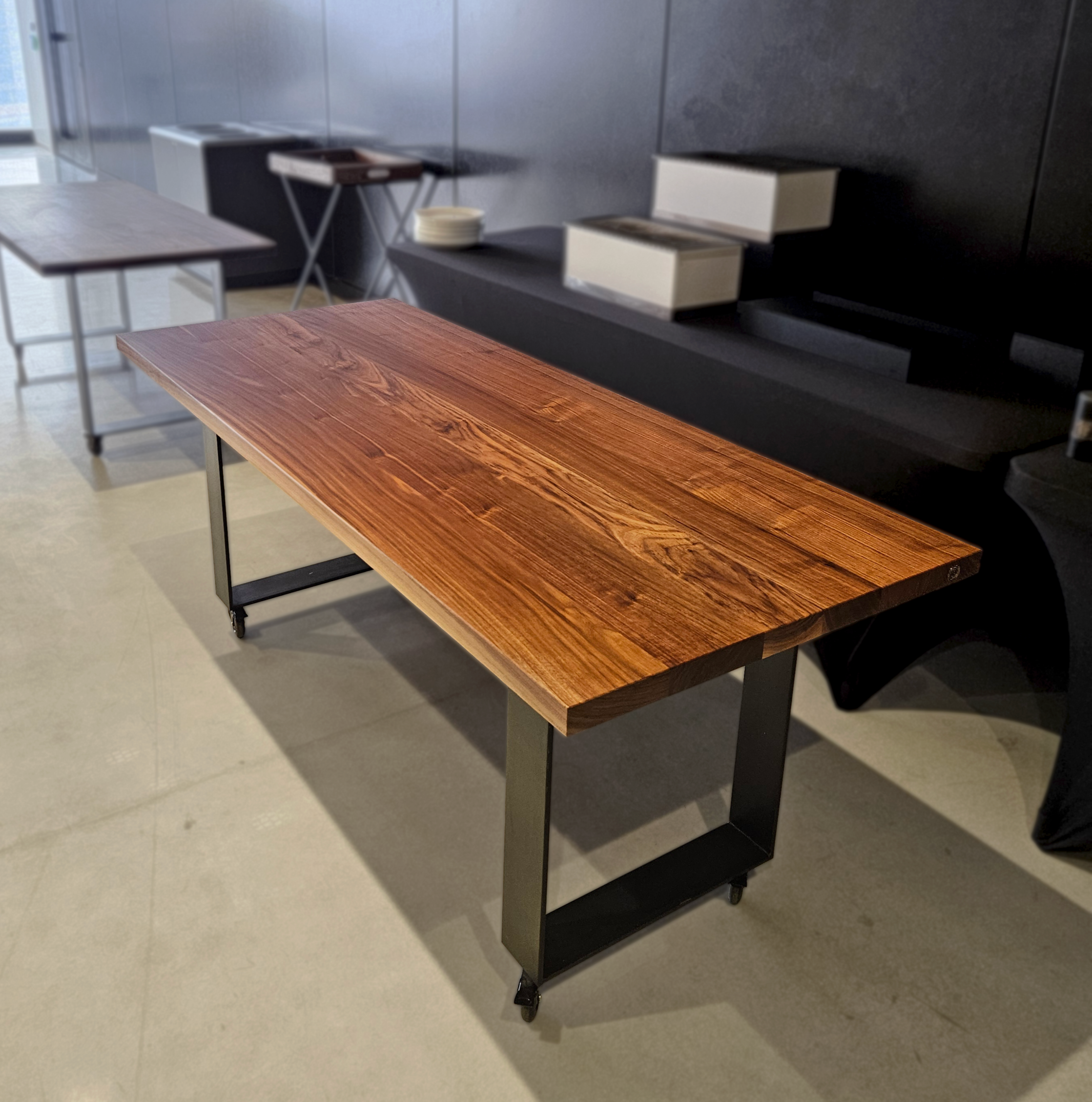WALNUT CATERING TABLE WITH STEEL STRAP LEGS